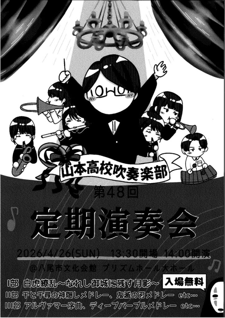 4月262026 山本高校吹奏楽第48回定期演奏会 山本高校吹奏楽第48回定期演奏会 <予定プログラム> Ⅰ部 白虎繚乱~なれし御城に残す月影~ Ⅱ部 千と千尋の神隠しメドレー、鬼滅の刃メドレーetc・・・ Ⅲ部 アルヴァマー序曲、ディープパープルメドレーetc・・・ ■日時 2026年4月26日(日) 開場13:30/開演14:00 ■会場 八尾市文化会館 プリズムホール 大ホール 入場無料・全席自由