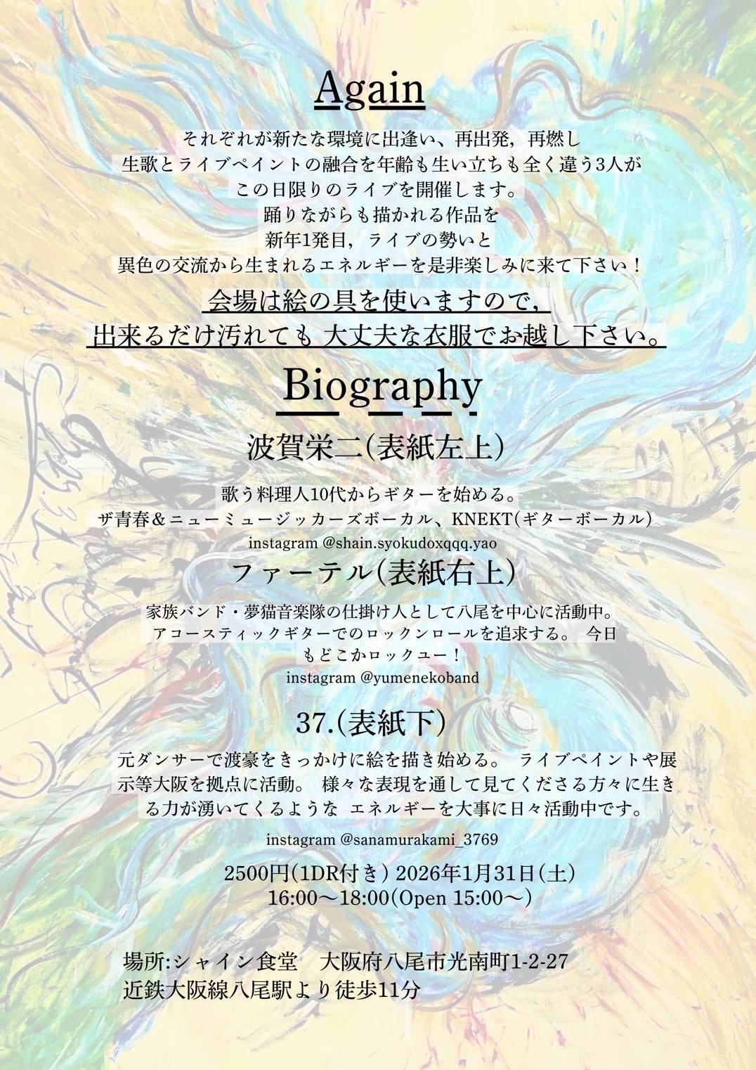 1月312026 Again 日時 2026/1/31(土)16:00-18:00(open 15:00~)場所 シャイン食堂住所 大阪府八尾市光南町1-2-27《again》それぞれが新たな環境に出逢い、再出発,再燃し生歌とライブペイントの融合を 年齢も生い立ちも全く違う3人がこの日限りのライブを開催します。踊りながらも描かれる作品を新年1発目,ライブの勢いと異色の交流から生まれる エネルギーを是非楽しみに来て下さい!