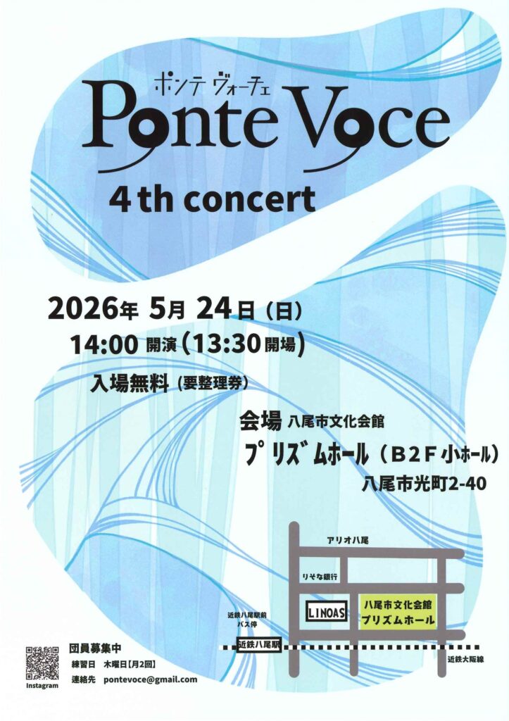 5月242026 ポンテ ヴォーチェ 4th concert Ponte Voce 4th concert ■日時 2026年5月24日(日) 開場13:30/開演14:00 ■会場 八尾市文化会館 プリズムホール B2階 小ホール (八尾市光町2-40 近鉄大阪線「近鉄八尾」駅より東へ徒歩約6分) ■入場無料(要整理券)■ ■お問合せ ポンテ ヴォ―チェ TEL:090-7368-7745