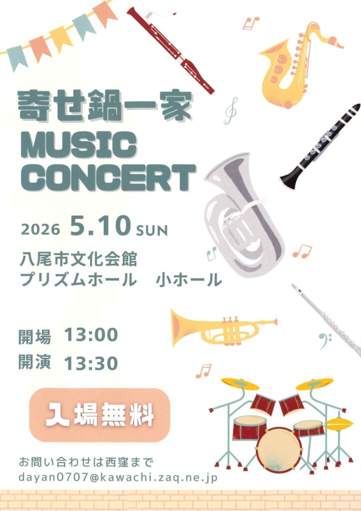 5月102026 寄せ鍋一家 MUSIC CONCERT 寄せ鍋一家 MUSIC CONCERT ■日時 2026年5月10日(日) 開場13:00/開演13:30 ■会場 八尾市文化会館 プリズムホール B2階 小ホール (八尾市光町2-40 近鉄大阪線「近鉄八尾」駅より東へ徒歩約6分) ■入場無料■ ■お問合せ E-mail:dayan0707@kawachi.zaqt.ne.jp(西窪)